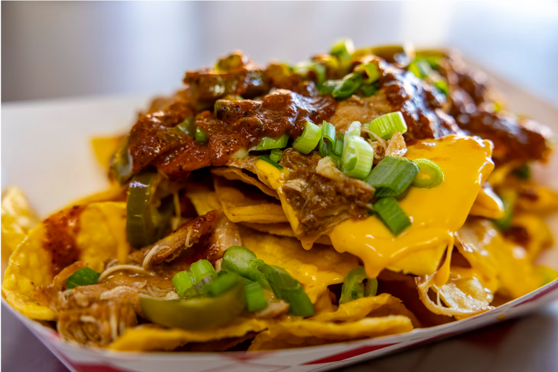 House-made tortilla chips piled high with queso, jalapeños, pico de gallo, sour cream, and your choice of protein