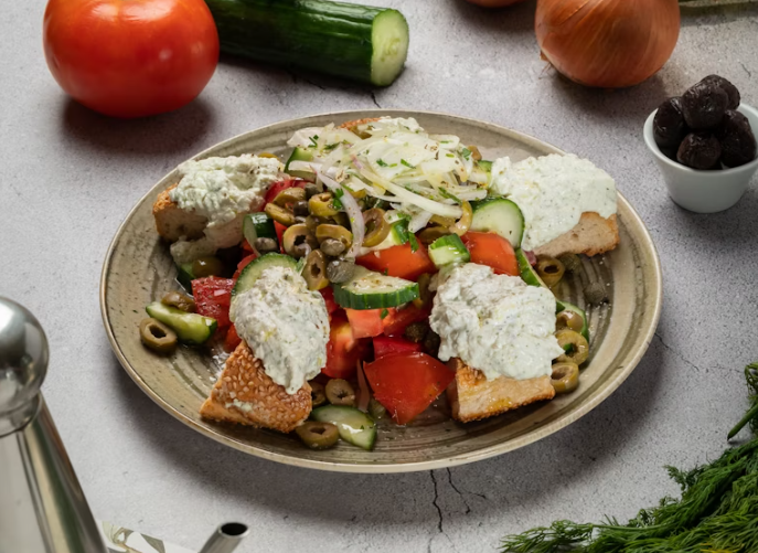 Mixed greens, feta, kalamata olives, tomatoes, cucumber, red onion with lemon herb vinaigrette