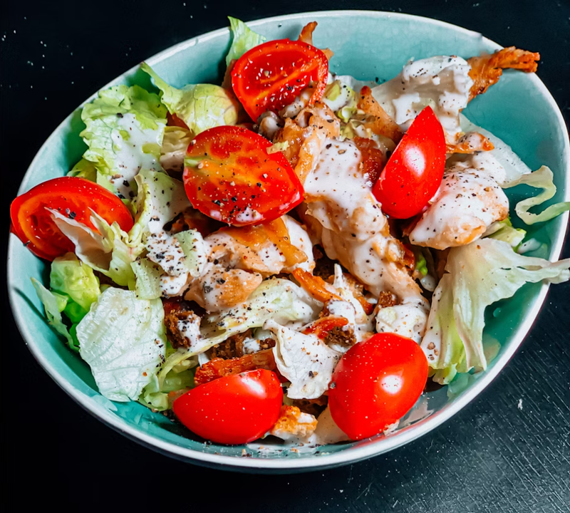 Grilled chicken breast, bacon, hard-boiled egg, avocado, tomatoes, blue cheese over mixed greens