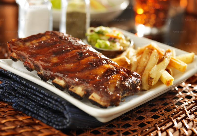 Full rack of baby back ribs, house BBQ sauce, coleslaw, and fries