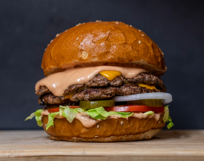 Half-pound Angus beef, cheddar, bacon, lettuce, tomato, onion, house sauce on brioche