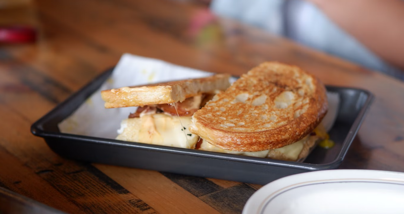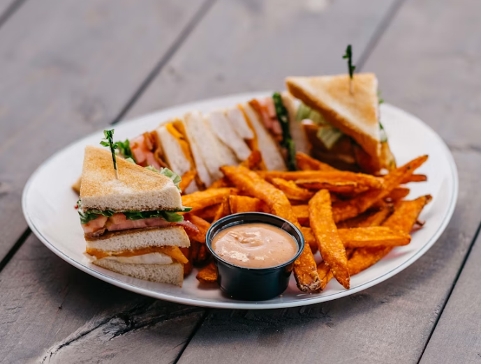Triple-decker with turkey, bacon, lettuce, tomato, mayo on toasted sourdough