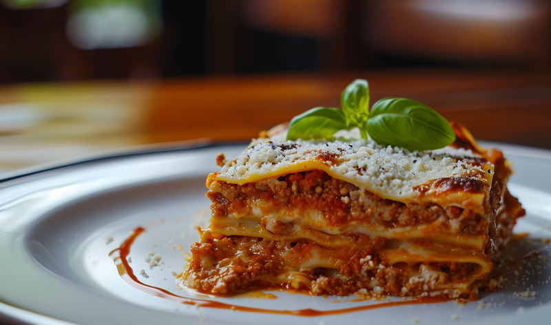 Layers of pasta, meat sauce, ricotta, mozzarella, baked to perfection